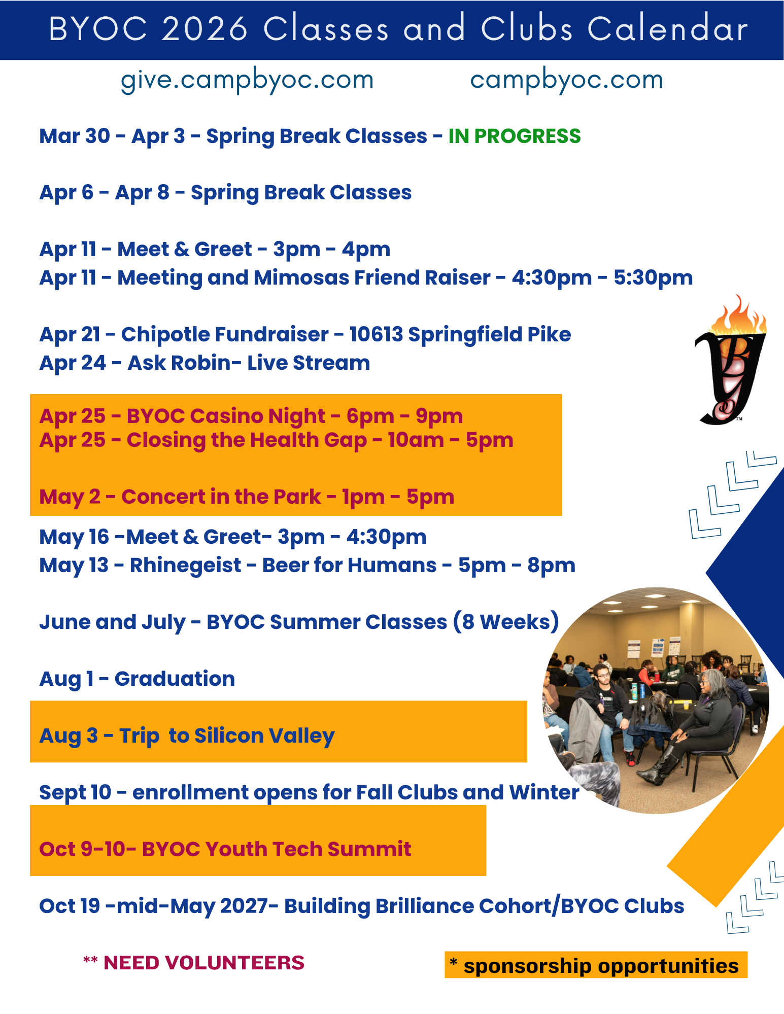 Join us at our free concert in BYOC's parking lot - 1 Sheakley Way, 45246. Fun activities, food and community engagement. Share this far and wide. All are welcome! We are raising $$ for scholarships for youth. Your donations at the event will make this a success.